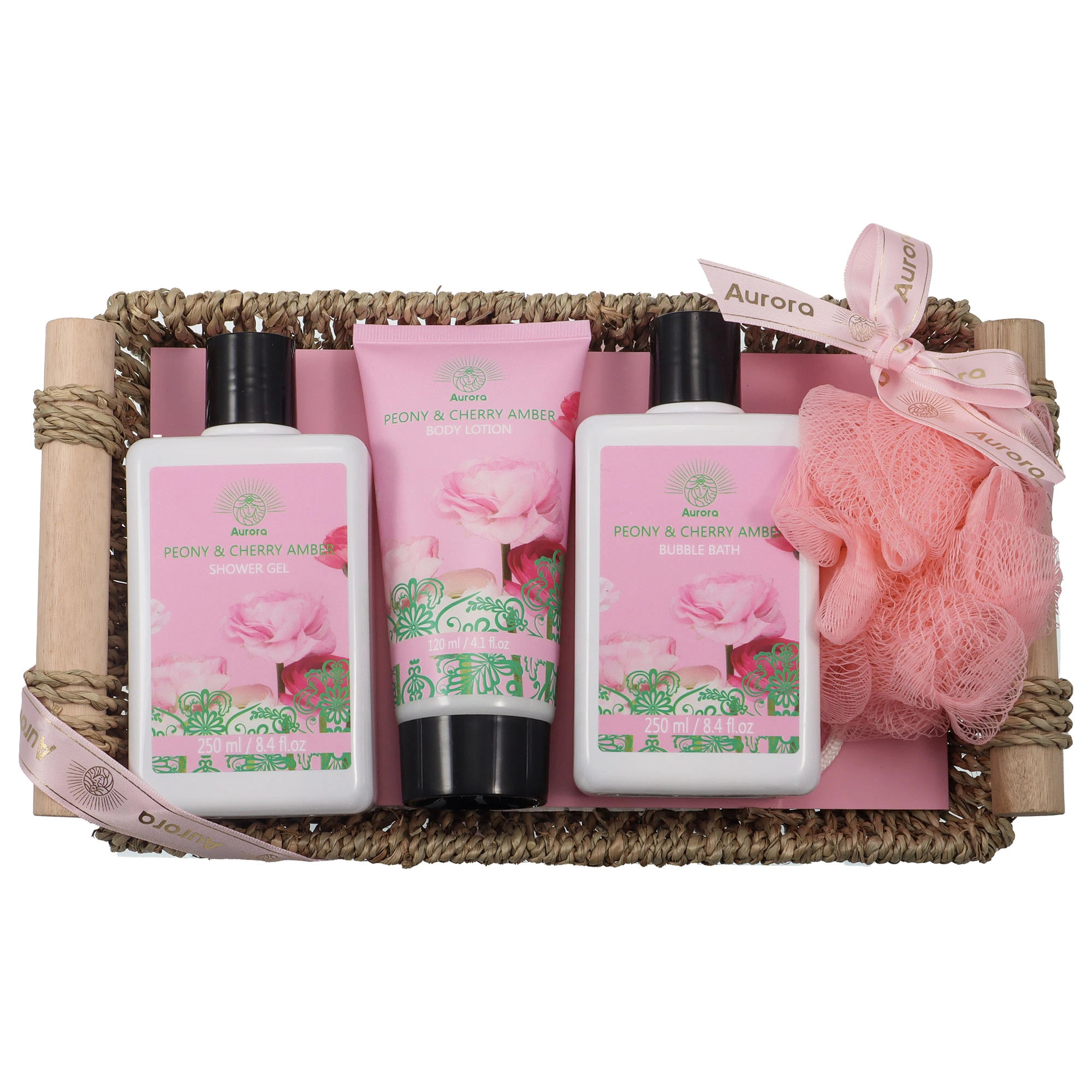 Darčeková sada - kazeta Pivónia a Čerešňový Jantár : 250ml Sprchový gél 250ml Pena do kúpeľa 120ml Telové Mlieko 15g Hubka do kúpeľa