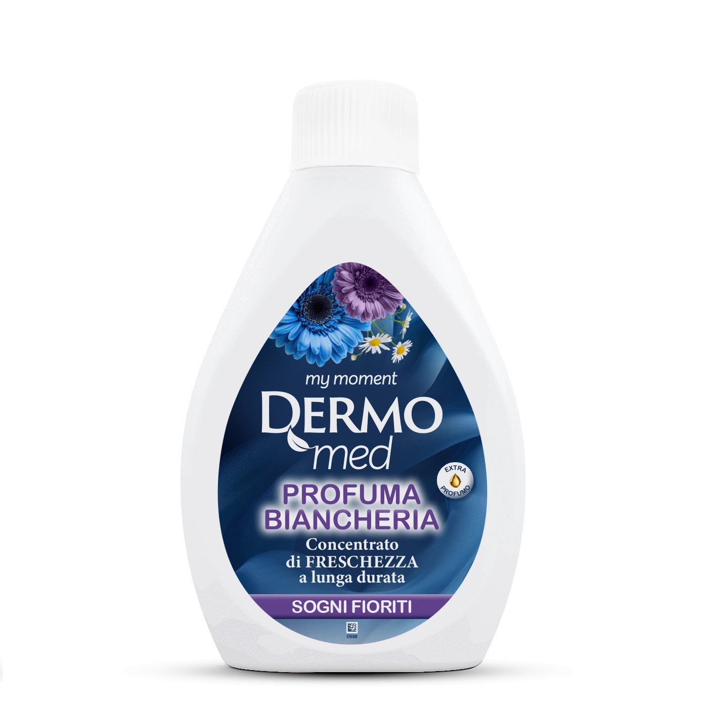 DERMOMED Profuma Biancheria Sogni Fioriti je parfum na bielizeň s jemnou kvetinovou vôňou, ktorý dodá oblečeniu dlhotrvajúcu sviežosť a pocit čistoty. Je vhodný na použitie v práčke, pri ručnom praní aj v sušičke. Intenzitu vône je možné upraviť podľa množstva dávkovania.