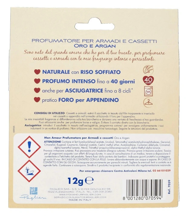 Parfumované vrecko do skríň, šuplíkov, športových tašiek a sušičiek na bielizeň Mon Amour Oro e Argan je hrejivá a zmyselná vôňa, ktorá vás obklopí orientálnymi tónmi arganu, vanilky a ambry.