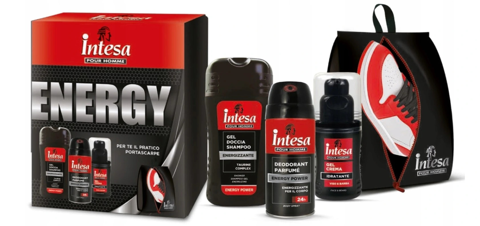 Kozmetický set INTESA POUR HOMME Energy - deodorant 150 ml + sprchový gél-šampón 250 ml + krémový gél na tvár 100 ml + taštička na topánky Objavte jedinečnú starostlivosť so súpravou INTESA, ktorá kombinuje všetko, čo potrebujete pre každodennú hygienu a sviežosť. Táto sada, odporúčaná pre mužov hľadajúcich kompletný produkt osobnej starostlivosti, sľubuje vynikajúce výsledky, pokiaľ ide o sviežosť aj pohodu pokožky. Set obsahuje šampón a sprchový gél 2v1 s objemom 250 ml, ktorý dôkladne umýva a osviežuje telo a vlasy a poskytuje tak dlhotrvajúcu, intenzívnu vôňu. Súčasťou balenia je aj deodorant, ktorý účinne chráni pred nepríjemným zápachom a zanecháva pocit sviežosti po celý deň. Hydratačný gélový krém na tvár a bradu. A tiež vrecko na obuv, ktoré sa skvele osvedčí pri cestovaní alebo výstupe do posilňovne. INTESA je ideálnym výberom pre mužov, ktorí oceňujú komplexnú starostlivosť a pohodlie v štýlovom prevedení. Ideálny nápad na darček alebo ako praktický set na každý deň. Zloženie:  Úplný zoznam zložiek nájdete na obale produktu alebo na oficiálnej webovej stránke Intesa. Sada môže vo všeobecnosti obsahovať zložky ako: voda (aqua), denaturovaný lieh, vôňa (parfum), glycerín a ďalšie špecifické zložky určené na starostlivosť o pokožku a bradu. Upozornenie: Používajte len na neporušenú pokožku. Zabráňte kontaktu s očami. V prípade kontaktu s očami, ihneď ich vypláchnite vodou. Ak sa objaví podráždenie, prestaňte používať. Uchovávajte mimo dosahu detí. Len na vonkajšie použitie.                                                                                        Výrobca:  Výrobca: Mirato S.p.A, Strada Provinciale Est Sesia SNC 28064 Landiona (NO), Italy www.mirato.it, info@mirato.it ,TEL: +39 0321 827711 Vyrobené v Taliansku Distribútor: C4U TRADE, s.r.o., Antona Bernoláka 7, 010 01 Žilina, Slovensko info@cleaning4u.sk , www.cleaning4u.sk EAN: 8003510037797