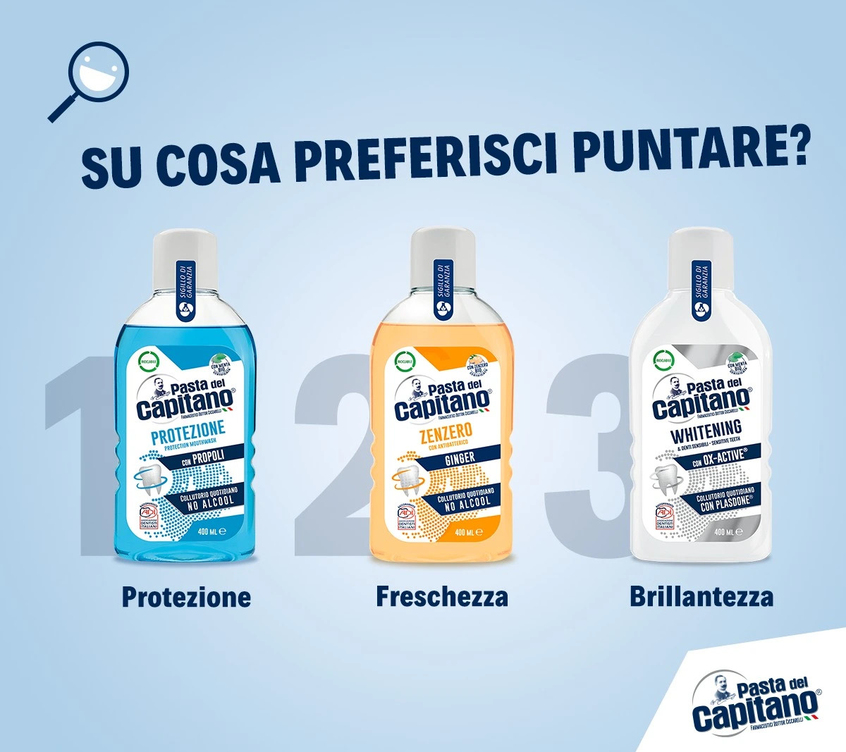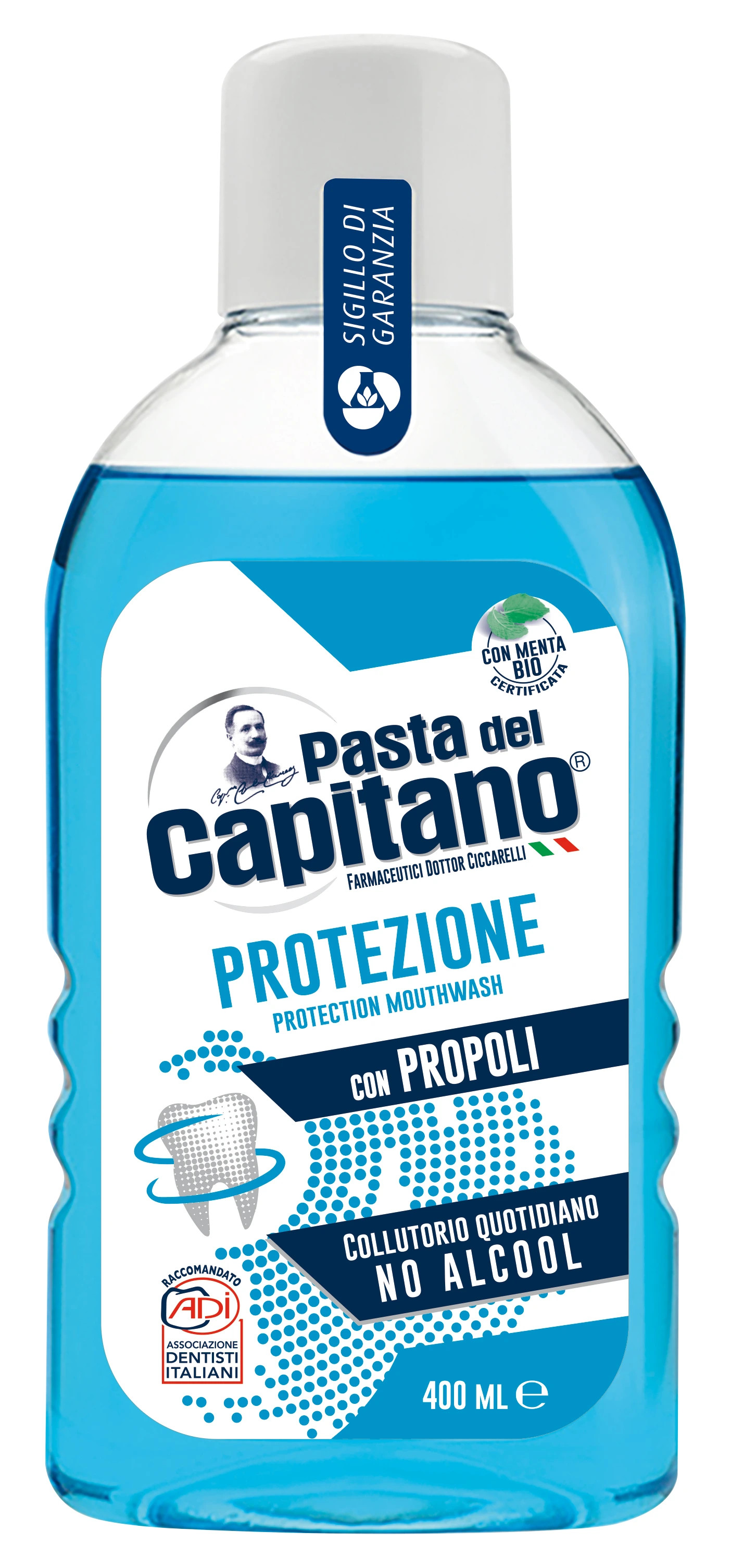 Pasta del Capitano Protezione ústna voda 400ML napomáha odstraňovaniu zubného povlaku. Je antibakteriálna, neobsahuje parabény, SLS, triklosan ani iné konzervačné látky. Zloženie s propolisom napomáha ochrane ďasien. Patentovaná zložka Sulfetal Zn® kombinuje antibakteriálne vlastnosti zinku s čistiacim účinkom povrchovo aktívnych látok získaných z pupočníka ázijského. Jedinečná a zároveň vzácna certifikovaná BIO mäta svojou osviežujúcou zložkou zosilňuje antibakteriálnu účinnosť ústnej vody a podporuje tak zlepšenie krvného obehu v ďasnách, čím zabezpečuje dlhodobo svieži dych. Testované na báze zubného lekárstva Posiľňuje ďasná a zabraňuje ich zápalom Zabraňuje tvorbe baktérii, zubného plaku a kazu Neobsahuje alkohol, parabény, SLS, triklosan a iné konzervačné látky